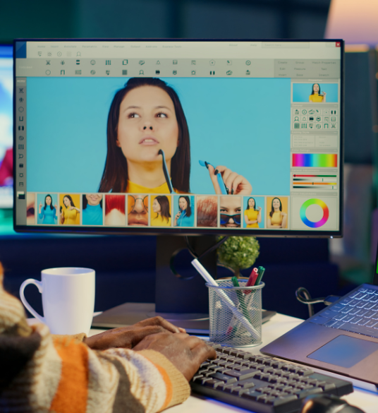 We primarily use industry-standard tools like Adobe Photoshop, Illustrator, and InDesign, along with Figma for collaborative web and UI/UX design projects.